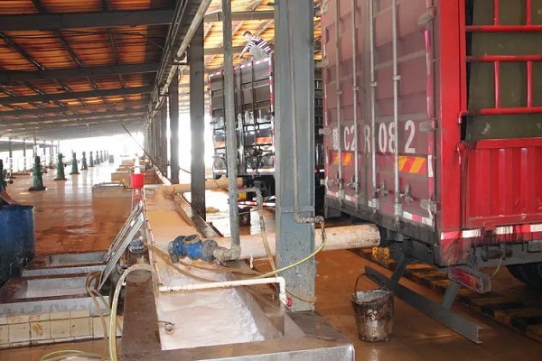 膠水車在金聯橡膠加工分公司卸膠水。簡日明 攝