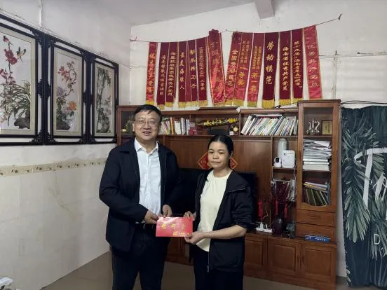 海南橡膠黨委副書記、總經理楊宇一行赴加釵分公司,走訪慰問了全國勞模、海南橡膠赴非專家虞海濃的家屬。