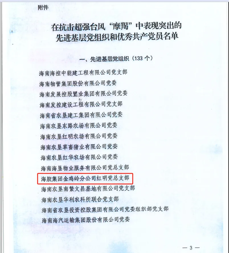 近日,中共海南省農墾投資控股集團有限公司委員會下發《關于表彰在抗擊超強臺風”摩羯“中表現突出的先進基層黨組織和優秀共產黨員的決定》。海南橡膠黨委、金雞嶺分公司紅明黨總支、西聯分公司新盈片區黨總支、紅光分公司紅旗片區黨總支第四支部等4個先進基層黨組織,海南橡膠黨委委員、副總經理陳皞,人力資源部高雷,瑞橡公司翟翊先,紅華分